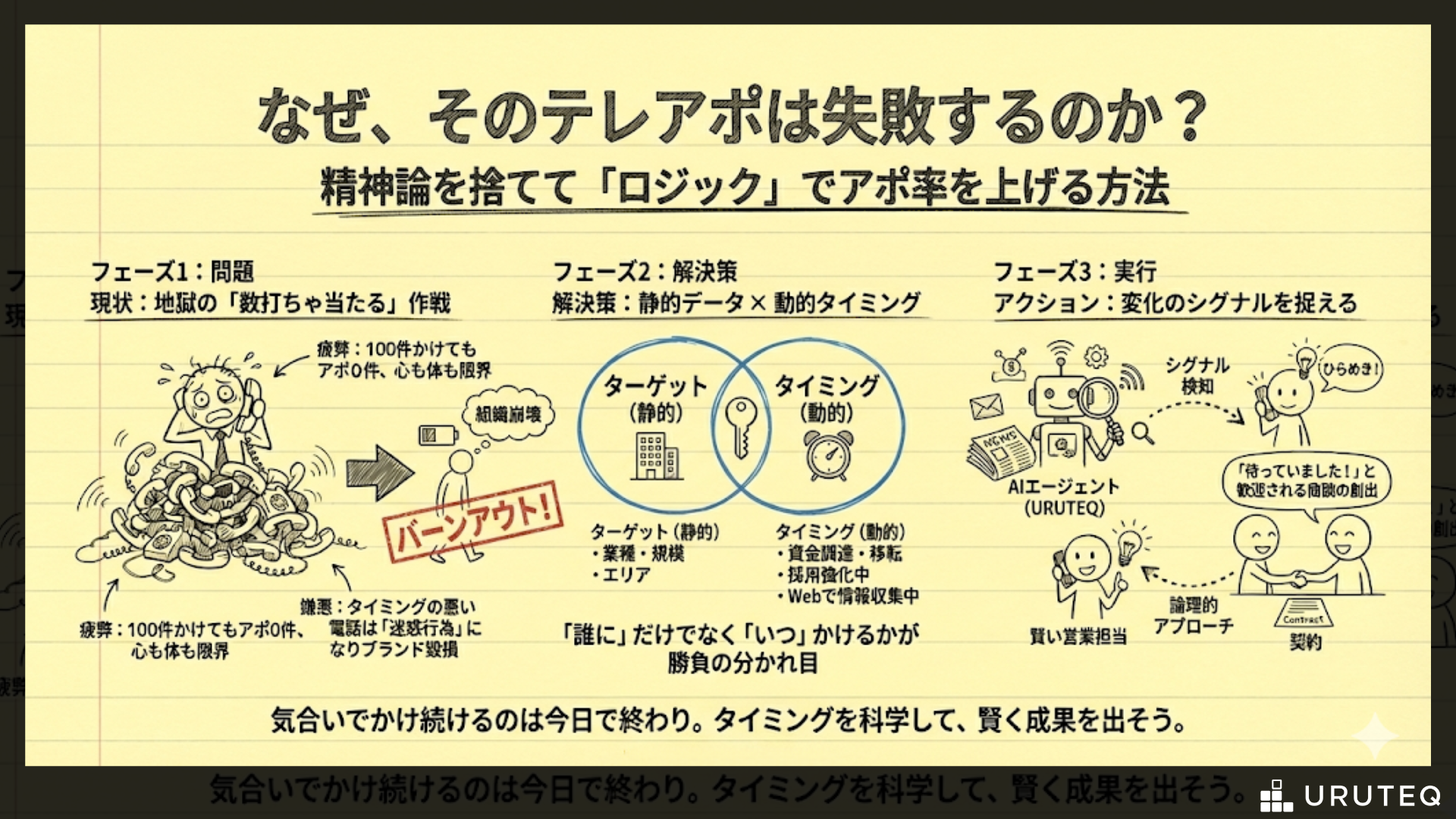 しかし、ここで一度立ち止まって考えてみてください。もしアポ率が上がらない本当の原因が、あなたのスキルや努力不足ではなく、そもそも「電話をかける相手」と「かけるタイミング」という構造的な問題にあるとしたらどうでしょうか。
