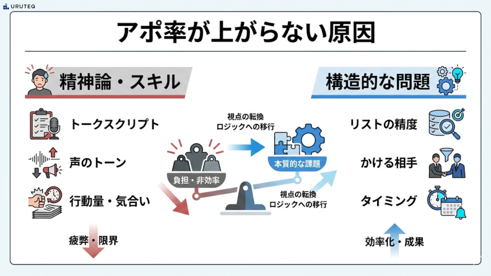 アポ率が上がらないとき、多くの現場では「トークスクリプトの改善」や「声のトーンの見直し」といったスキル面、あるいは「とにかく行動量を増やす」「断られてからが営業だ」という精神論的な対策が取られがちです。マネージャーからは「気合いが足りない」と檄が飛び、メンバーは疲弊していく。そんな悪循環に陥っている組織も少なくありません。