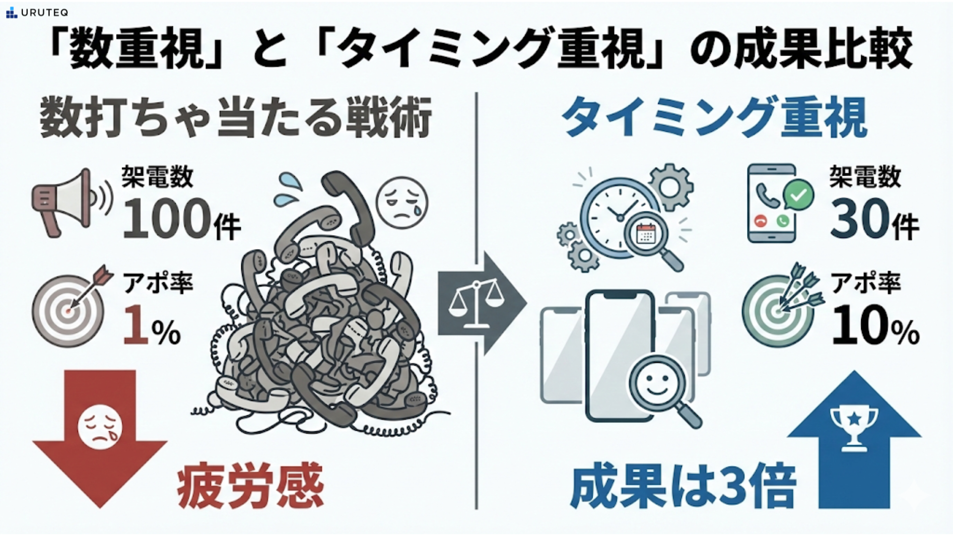 100件かけてアポ1件(1%)のリストと、タイミングを見極めて30件かけてアポ3件(10%)のリスト。どちらがビジネスとして効率的でしょうか。後者は架電数こそ少ないですが、成果は3倍です。さらに、架電にかかる時間や精神的コストも大幅に削減できます。