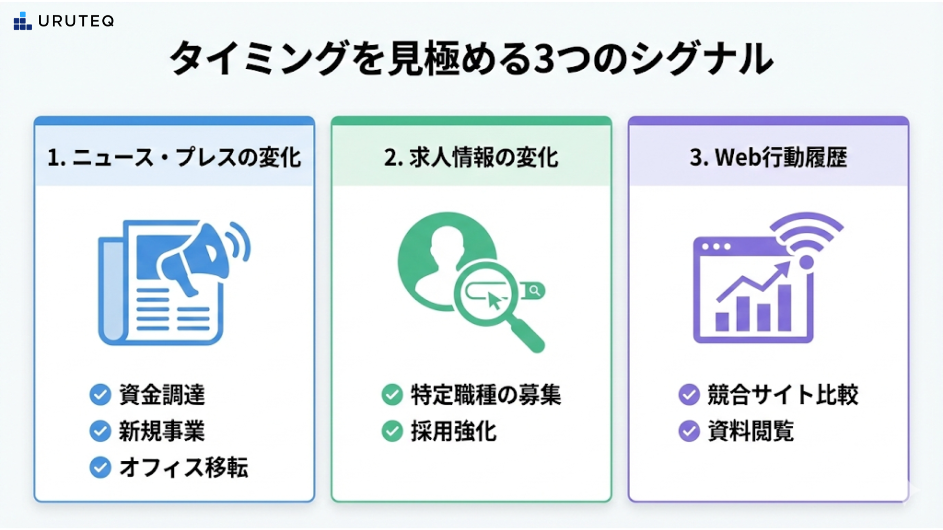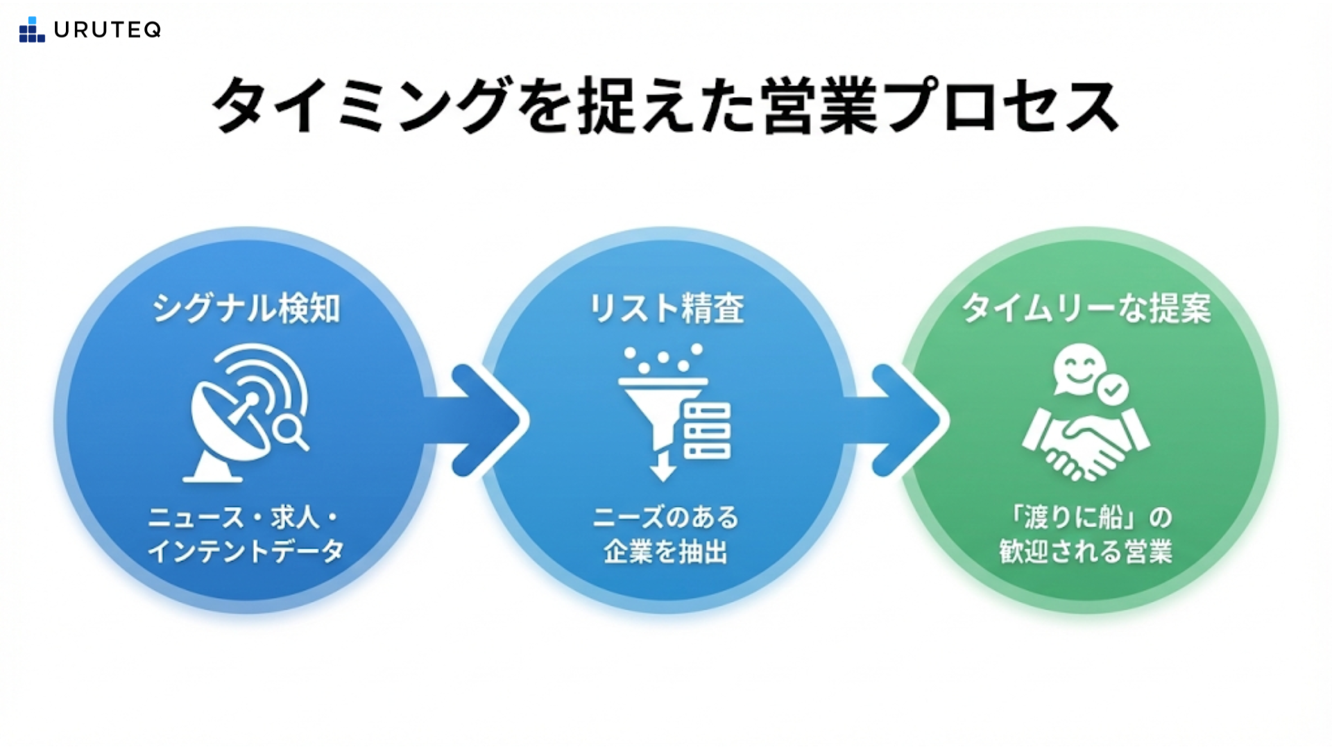 私たちURUTEQのようなツールを活用することで、こうした「興味関心の高まり」を企業単位で検知し、ニーズが顕在化した瞬間にアプローチすることが可能になります。相手が情報を探している最中に連絡ができれば、それは「迷惑電話」ではなく「タイムリーな情報提供」として歓迎される可能性が高まります。