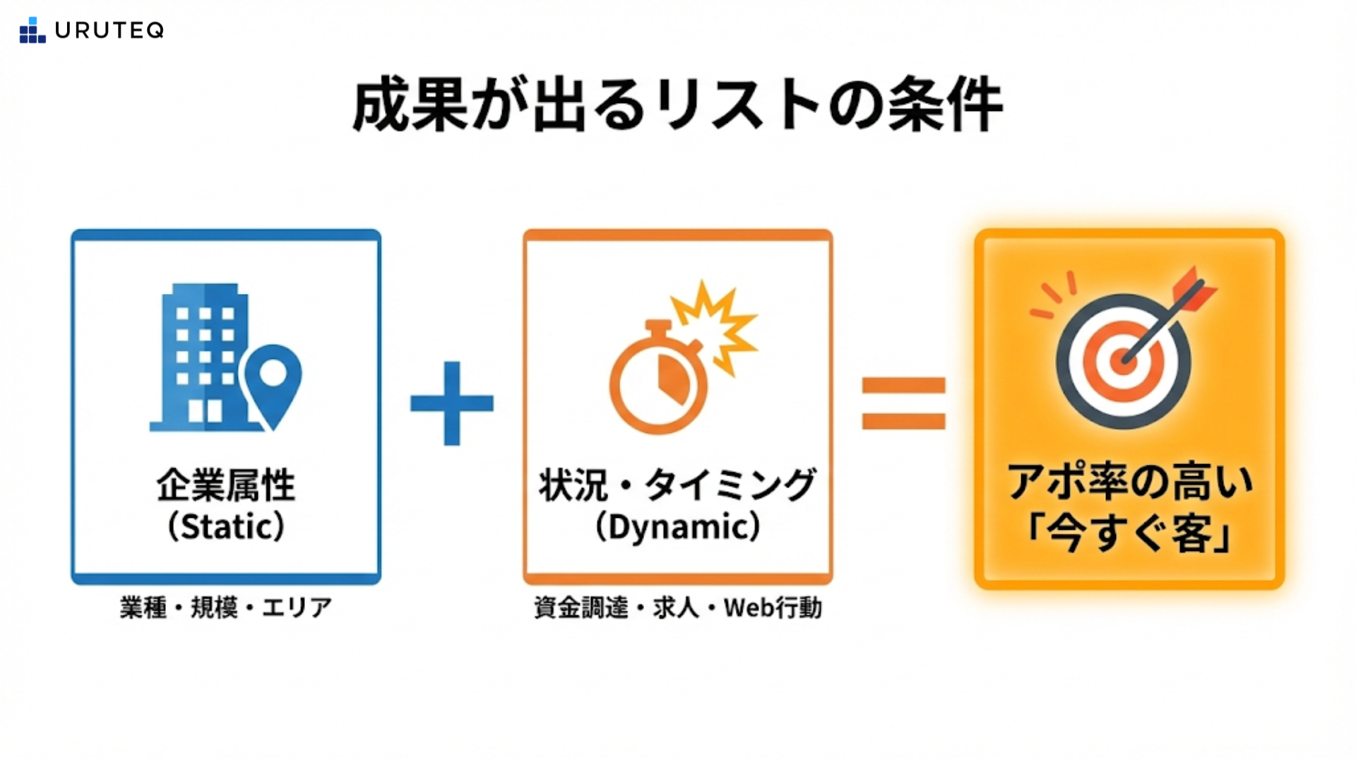 では、成果が出る営業リストと、そうでないリストの決定的な違いはなんでしょうか。それは「企業属性(Static)」だけでなく「状況・タイミング(Dynamic)」が含まれているかどうかにあります。