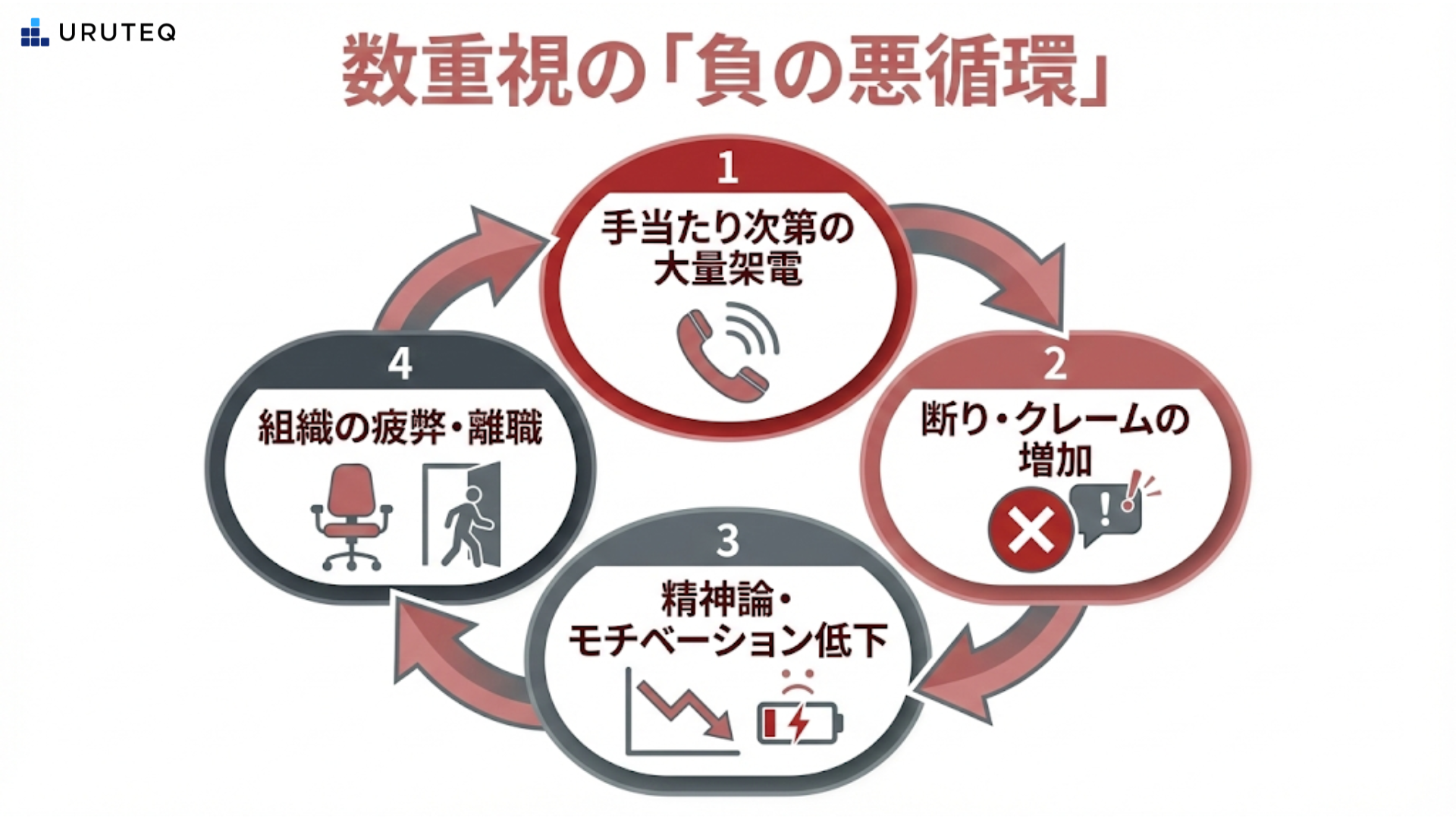 彼らが犯した間違いは、営業担当者のスキル不足ではありませんでした。「誰に、いつかけるか」という戦略を持たず、確率論だけに依存してしまったことこそが、失敗の本質だったのです。この事例は、リソースの浪費だけでなく、組織そのものを壊しかねない「数重視」の危険性を教えてくれます。