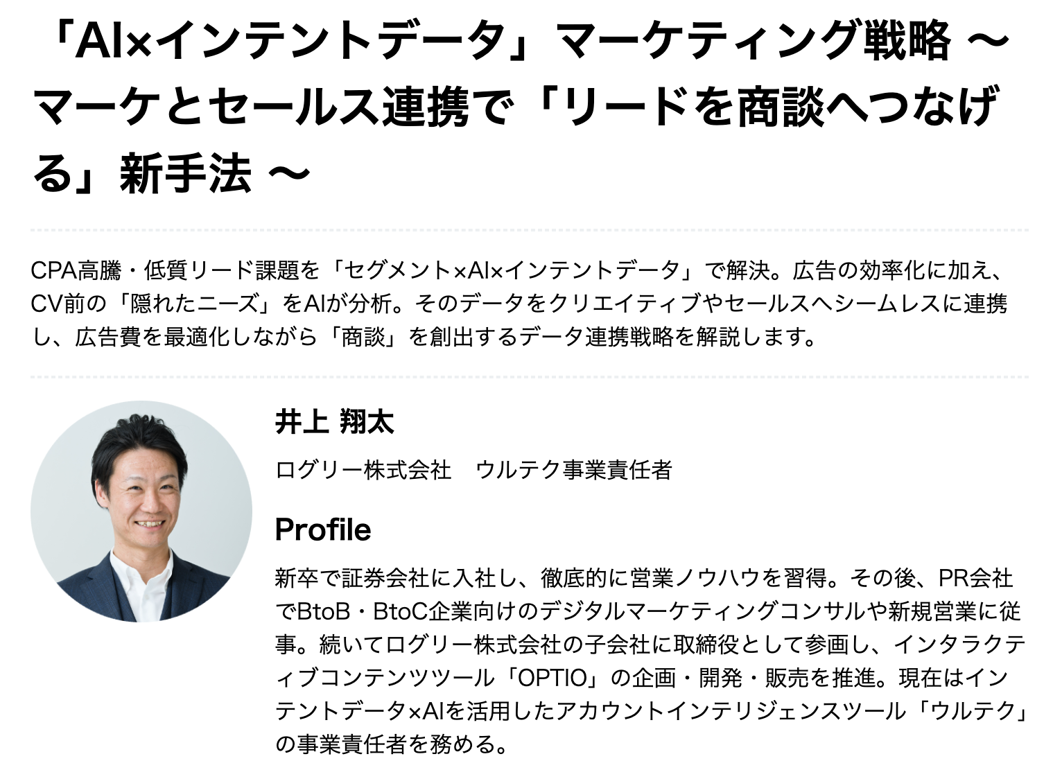 参加者は、自社に必要な施策の優先順位を見極め、広告費を無駄にせず成果を最大化する戦略の理解に加え、リードを獲得後に確実に受注へとつなげるナーチャリング施策の具体的な手法まで、実践的なヒントを得られます。
