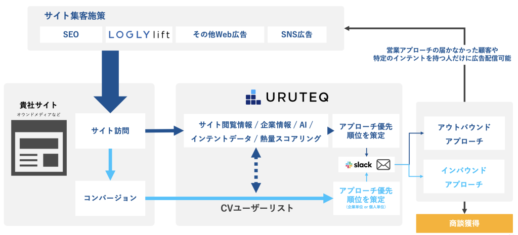 ウルテクはインテントデータとAIを活用した次世代のABMツールです。自社サイト内外のデータを活用しスコアリングを行い”今”ニーズが高まっている隠れた顧客を特定。見込み顧客の獲得と育成サイクルを自動化し、マーケティングと営業の連携を強化して営業成果最大化を実現します。